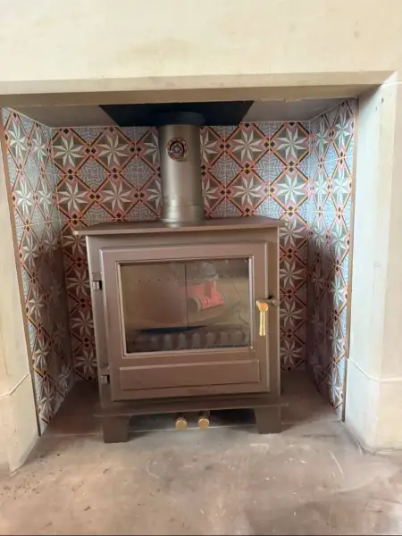 A standout feature of this installation is the eye-catching decorative tile work lining the interior walls of the fire chamber. Our client selected stunning patterned tiles featuring an intricate geometric design in warm terracotta, cream, and blue tones with ornate starburst and floral motifs. These tiles not only protect the chamber walls from heat but also create a striking visual contrast against the grey finish of the Clock Blithfield 5 stove.